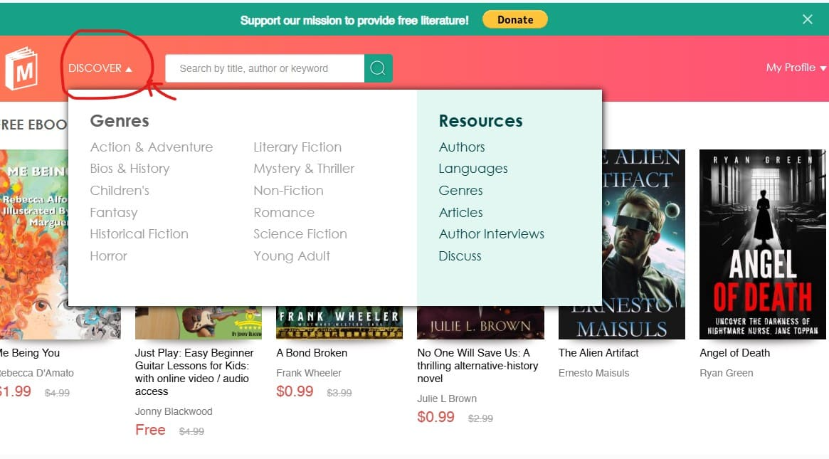 Many Books의 가장 인기있는 장르는 판타지, 과학소설, 추리소설이나 로맨스영역이 인기사이트로 메인의 disciver아래 바로 가기 메뉴가 있어서 편리하게 사용가능합니다.