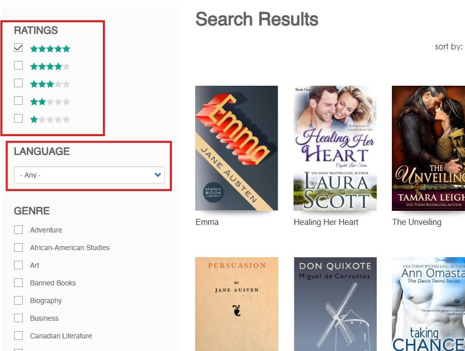 3. 원하는 카테고리나 글 형식, 또는 작가등을 선택했다면 책의 목록이 나오게 됩니다. 목록에서 원하는 책을 선택하시면 됩니다. 우측편에 사용자 리뷰 점수가 표시되어 리뷰 점수에 맞는 목록을 다시 세분화하여 볼 수 있는 것이 Many Books의 가장 큰 특징입니다. 또한 언어를 선택할 수 있어서 다양한 언어로 책을 볼 수 있습니다.