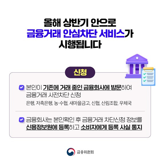 - 전 금융기관 적용: 한 번의 신청으로 모든 금융기관에서의 여신거래를 차단할 수 있습니다.