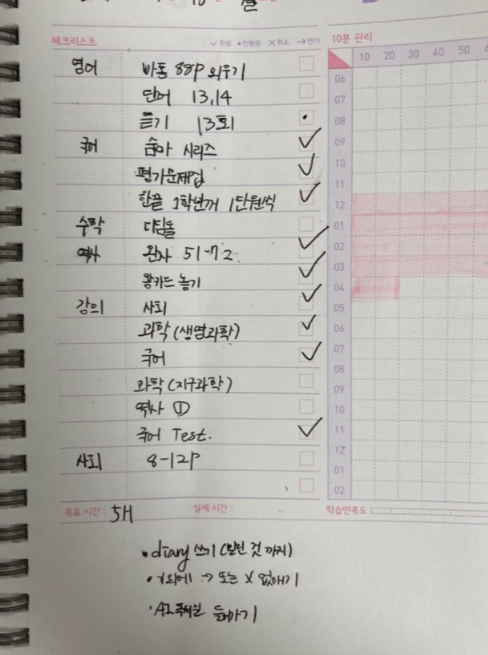 이렇게 플래너를 작성하고 시간 체크를 통해 하나씩 해 나가면 점점 학습량이 늘어날 것이고 쉬는 시간도 늘어날 것이다. 적절한 쉬는 시간을 취하기 위해 하루에 할애할 수 있는 시간을 최소한 공부시간의 20% 정도를 배치하도록 하자. 쉬지 않고 일한 뇌는 쉽게 피로해져 효율이 떨어질 것이다. 플래너 작성을 통한 성공적인 시간관리를 통해 학업에 많은 도움이 될 수 있도록 하자.