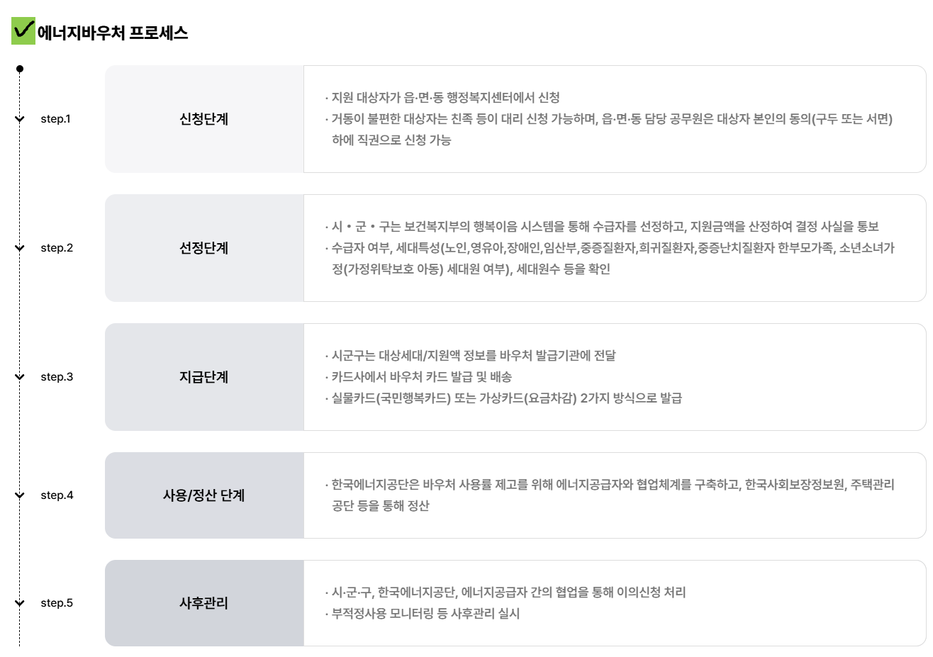 - 연탄·등유·LPG 등은 등록된 가맹점에서 수기 결제 → 바우처 자동 적용